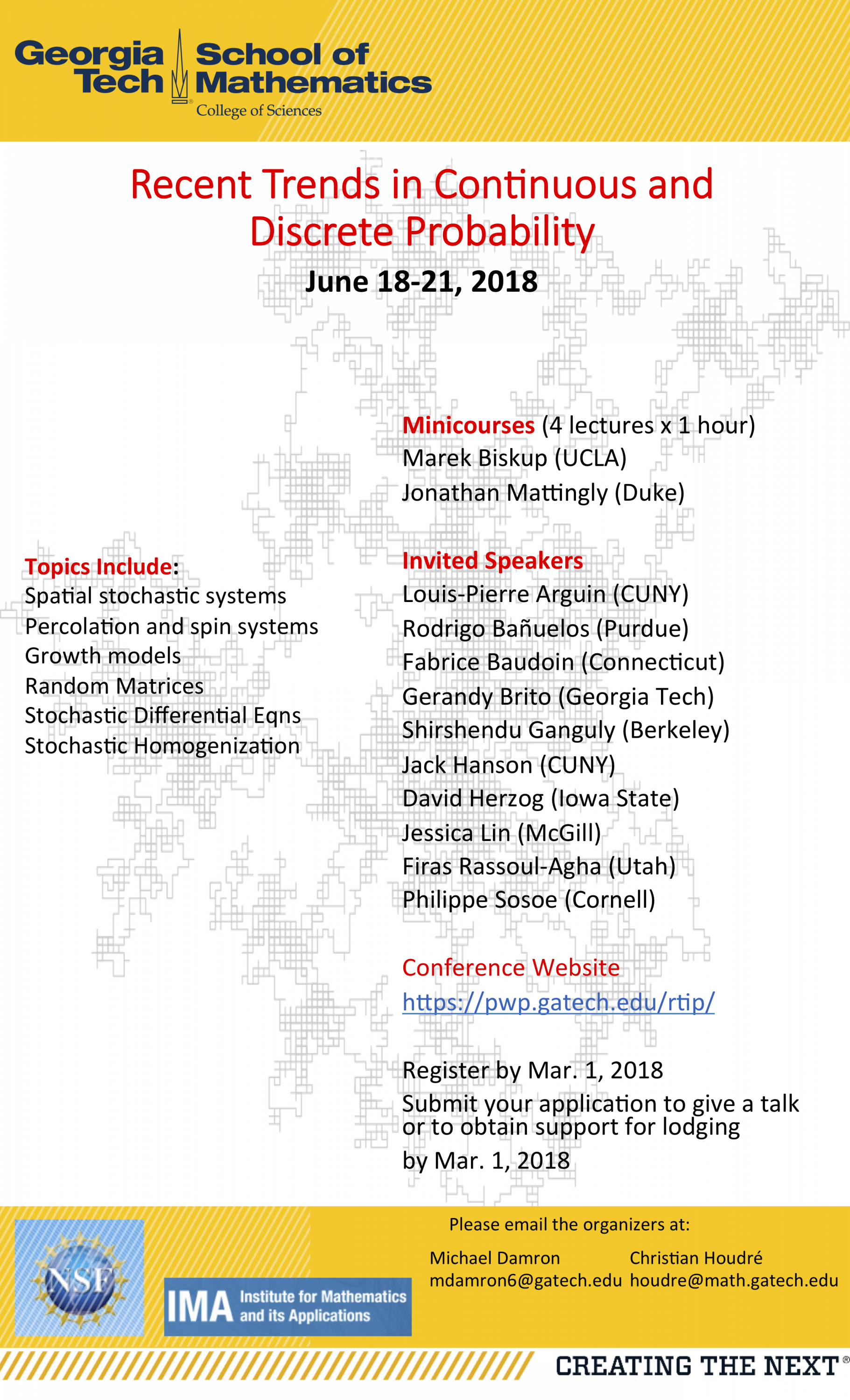 If you would like to give a talk or obtain support for lodging, kindly submit your application by Mar. 1, 2018. Please email the organizers Christian Houdré and Michael Damron.